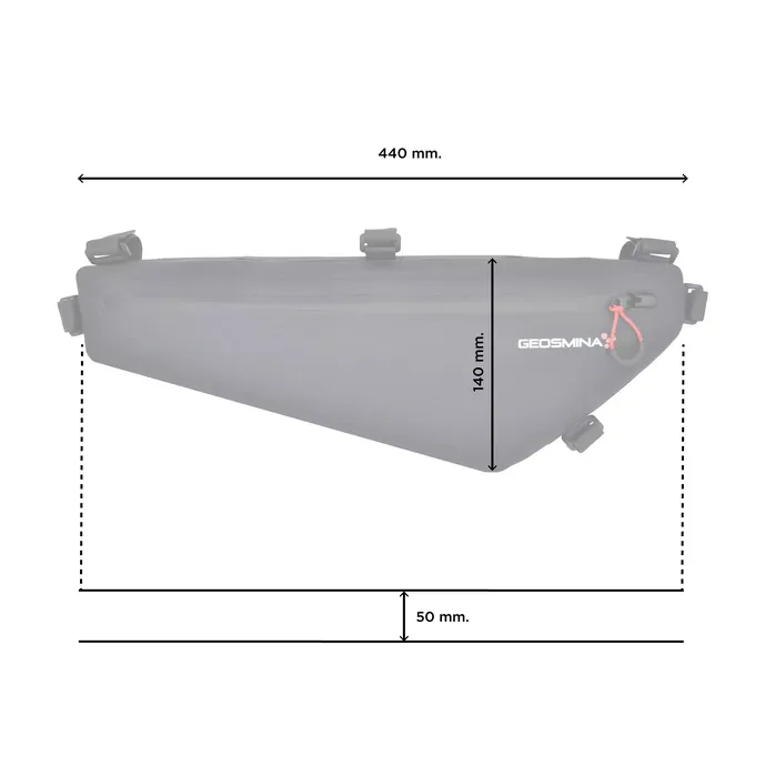 The bags come in three sizes: Small (1.5 liters), Medium (3 liters) and Large (5 liters). The bag gets attached to the frame by means of removable and interchangeable Velcro straps that are reinforced with Hypalon (a Rubberised and stupid strong textile) to adds both strength, security and anti slip / anti roll characteristics to both straps and bag. Geosmina provides two different lengths of straps with the frame bag, so you can fine tune to any tube shape.
