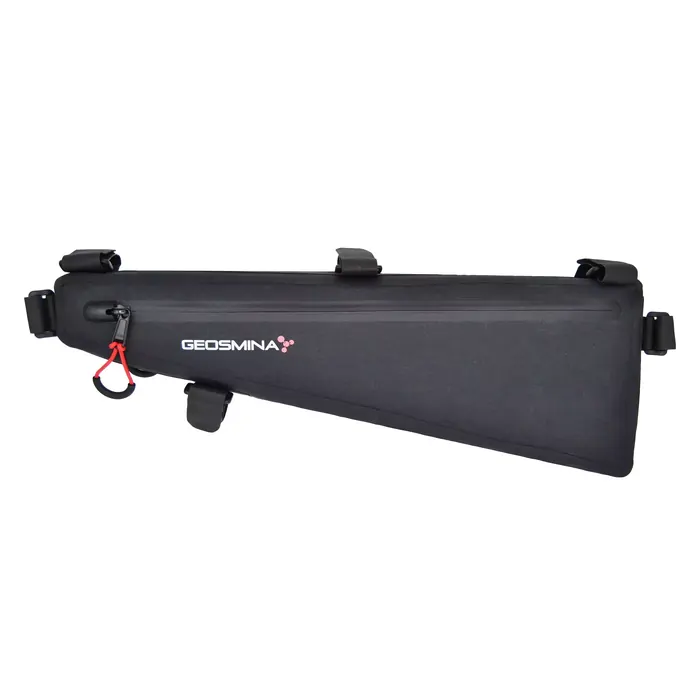 The bags come in three sizes: Small (1.5 liters), Medium (3 liters) and Large (5 liters). The bag gets attached to the frame by means of removable and interchangeable Velcro straps that are reinforced with Hypalon (a Rubberised and stupid strong textile) to adds both strength, security and anti slip / anti roll characteristics to both straps and bag. Geosmina provides two different lengths of straps with the frame bag, so you can fine tune to any tube shape.
